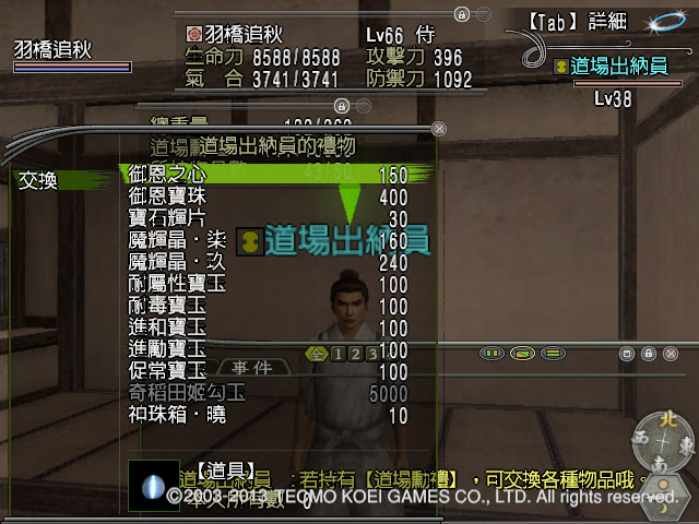 武士道場跟藤岡屋一樣會有專屬的點數,可以跟旁邊的NPC換東西,目前能換到這些