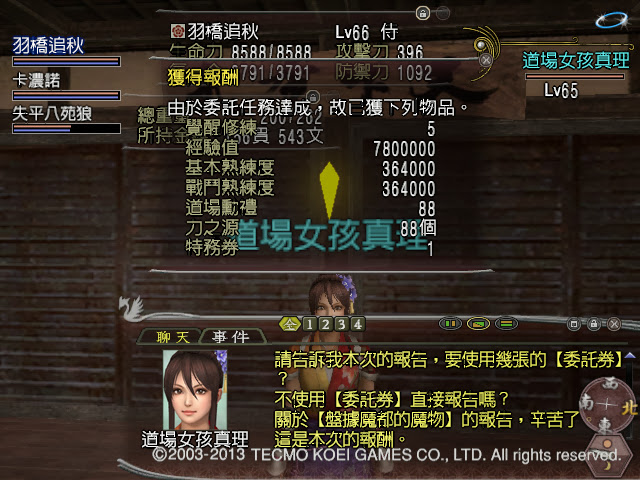 五場增加一千的覺醒紅利、基本經驗潛在、道場勳禮,以及提升軍神用的力之源(新地圖打怪也會掉),還有可以打特殊委託的特務卷一張。